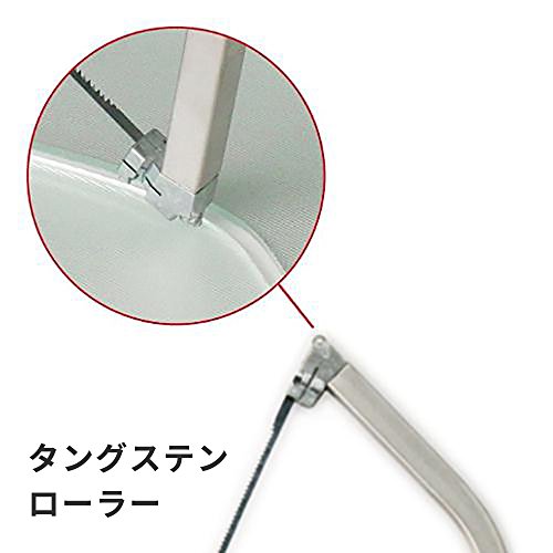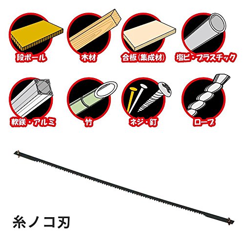 - 切断可能材料:平ノコ刃/ダンボール・木材・合板(集成材)・塩ビ・プラスチック、糸ノコ刃/ダンボール・木材・合板(集成材)・塩ビ・プラスチック・軟鉄・アルミ・竹・ネジ・釘・ロープ、ダイヤモンド刃/ガラス・レンガ・タイル