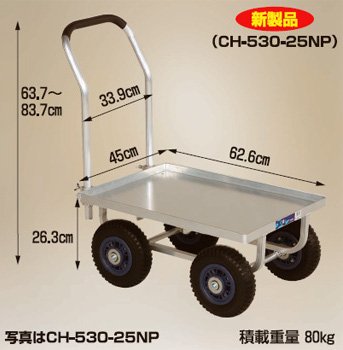 荷台が20kgコンテナ用(CH-500タイプ)より一回り 大きいため幅広い用途に使用できます。 ハンドルの幅が狭いため、後方からの荷物の出し入れ がスムーズに行えます。 ハンドルを片側2箇所のネジでしっかり固定しています。 また、手で締めるネジには脱落防止、ゆるみ防止のバネ付きです。 商品仕様 CH-530-25NP アルミ板付 ノーパンクタイヤ(2.50-4N) 積載重量 約80kg 重量 約8.2kg ※詳細サイズ画像に記載ありますのでご確認下さい。