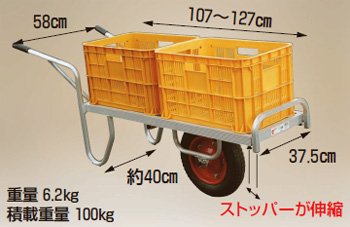アルミ製平形一輪車 幅せまタイプ コンテナ縦2個用です。 ストッパーが伸縮しますので、各種 の作業に便利です。 商品仕様 CN-35D ※コンテナは別売です。 エアータイヤ 積載重量 約100kg 重量 約6.2kg ※詳細サイズ画像に記載ありますのでご確認下さい。