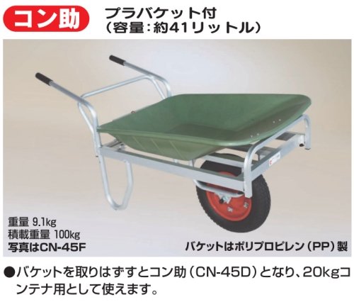 バケットを取りはずすとコン助(CN-45D) となり、20kgコンテナ用として使えます。 バケットは、ポリプロピレン(PP)製。 商品仕様 CN-45F プラバケット付 積載重量 100kg 重量 9.1kg ※詳細サイズ画像に記載ありますのでご確認下さい。