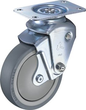 本体旋回部と車輪軸受け部にラジアルボールベアリングを採用しています。 内蔵スプリングの違いにより設定荷重が変わり使用範囲が幅広くなります。 旋回時、車輪回転時の音の発生を低減します。 RoHS適合品です。 振動走行や衝撃を嫌う精密機器や部品の搬送および医療機器や半導体関連施設での使用に適しています。 設定荷重(kgf):18 車輪径D(mm):100 車輪幅(mm):27 取付高H(mm):135~143 取付座A×B(mm):100×62 取付ピッチX×Y(mm):82×40 取付穴径P(mm):8.8 プレート式 ラジアルボールベアリング入 自在式