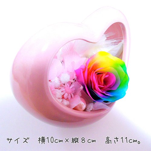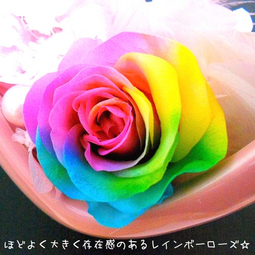 - 花材:すべて100%プリザーブドフラワー。プリザーブドレインボーローズ、アジサイ、スターフラワー、かすみ草。ピンクパール。