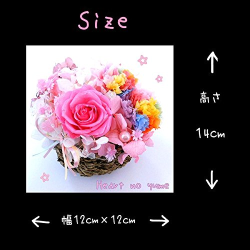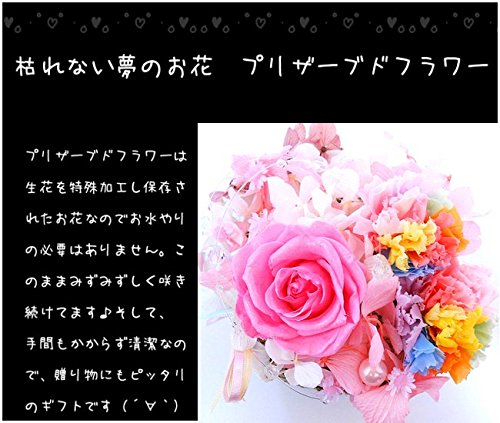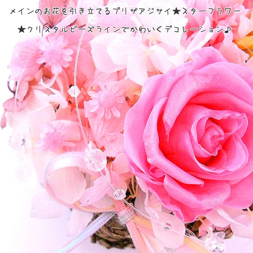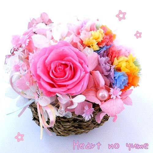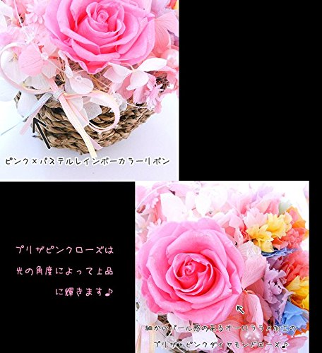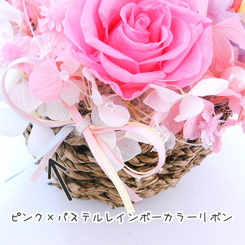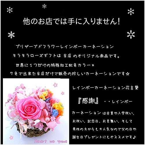 - 花材:すべて100%プリザーブドフラワー。レインボーカーネーション、キラキラピンクローズ、アジサイ、スターフラワー。ピンクパール、クリスタルライン。
