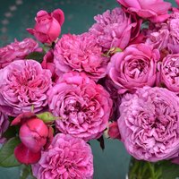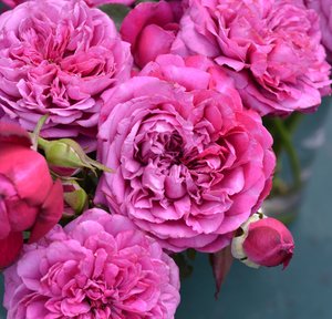 - 花色:赤紫。花期:四季咲き。樹高・幅:1.3m×0.8m、木立・直立。花径:8cm、ロゼット咲き。香り:中香。