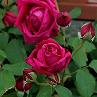 世の中には、いろいろな赤い大輪のつるバラはありますが、もっとも深く香り、花つき、勇壮さ、生命力、やさしさ、センスなど持ち合わせるのは、この品種だと思います。花はクリムゾンの抱え咲きで、濃厚なフルーツダマスク香があります。育てやすくて茂りやすい。 花径:8~10cm 樹高:2.5m 用途:オベリスク・アーチ・フェンス向き 花季:四季咲き⇒くり返しよく咲きます その他:香⇒豊かな香りのバラです