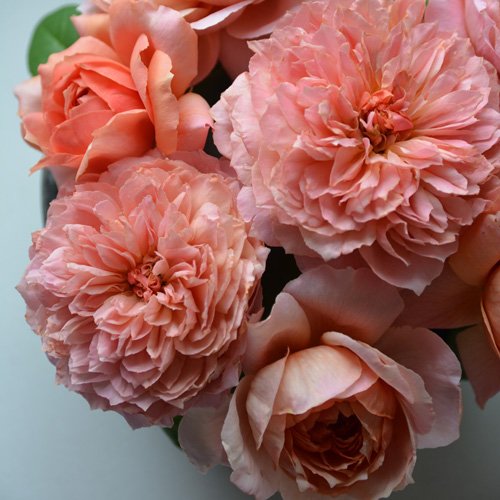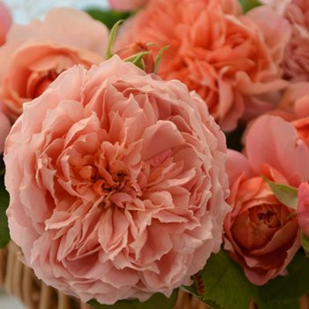 オレンジにサーモンピンクやベージュのグラデーションが美しいロゼット咲きのバラ。耐病性が強く、育てやすい品種です。花名は、パリ・モンマルトルのダンスホールから。アンティークな雰囲気のバラです。壁面やアーチにいっぱい咲かせたいですね。