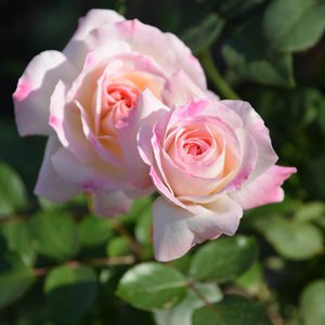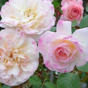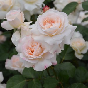 - 花色: 淡いオフホワイトにうっすらピンク。花期: 四季咲き。樹高・幅: 1.6m×1.0m。樹形: 木立ち。花径: 6~7cm、丸弁咲き。香り:中香。