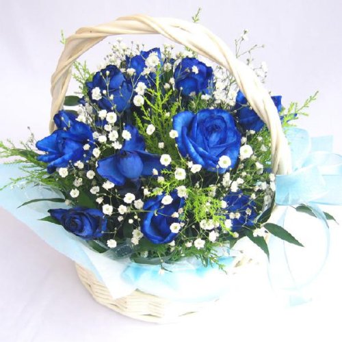 - 青いバラ8本にカスミソウの入ったバスケットアレンジメント。箱から出してすぐに飾ることができます。