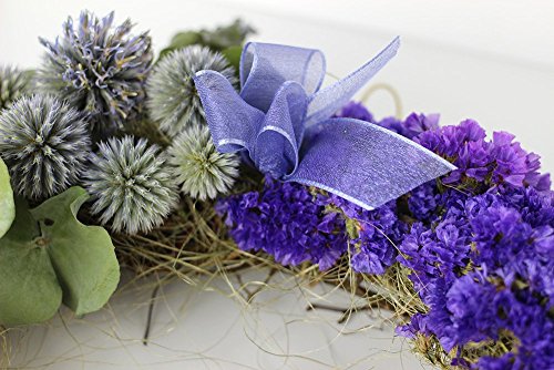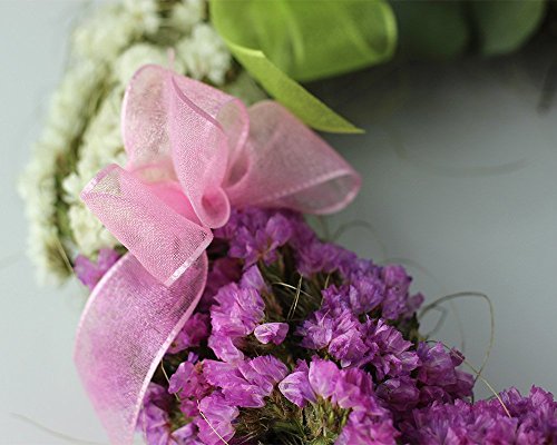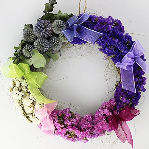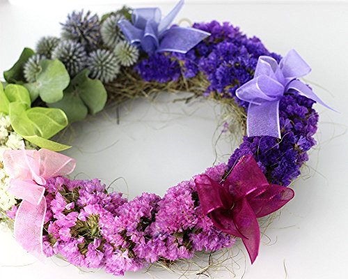 - ピンクから紫、そしてホワイトへと流れるようなお色で作ったフラワーリースです。旬のスターチスやルリ玉アザミをあしらい、アクセントにいれたオーガーンディのリボンがそよ風に揺れます。さわやかな信州で育った草花たちは自然乾燥されて優しい色合いをお楽しみいただけます。リビングや玄関に似合いそうな華やかなフォルムです。新築お祝いや記念日などこのまま贈りものにもどうぞ。専用の箱にお入れしてお届けします。