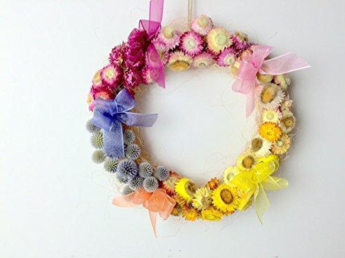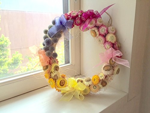 ピンクからイエロー、オレンジ そしてホワイトへと流れるようなお色で作ったザ・ローズショップオリジナルのフラワーリースです。信州で育った帝王貝細工にルリ玉アザミをあしらい、アクセントにいれたオーガーンディのリボンがそよ風に揺れます。さわやかな信州で育った草花たちは自然乾燥されて優しい色合いをお楽しみいただけます。リビングや玄関に似合いそうな華やかなフォルムです。新築お祝いや記念日などこのまま贈りものにもどうぞ。専用の箱にお入れしてお届けします。