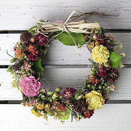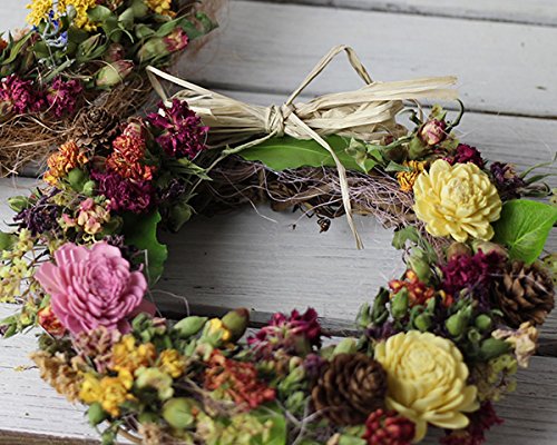 - 【資材】 ドライフラワー、ソーラーフラワー、木の実、リーフ、ラファ、シサル麻、リース台など。大きさ直径22センチくらい(こちらはMサイズです) 【ご注意ください】こちらは1点ずつ手作りをしており、画像イメージと若干変わる場合もございます。オーナメントや小花等は変わる場合もございます。 こちらは屋内専用です。