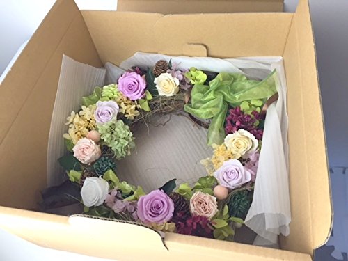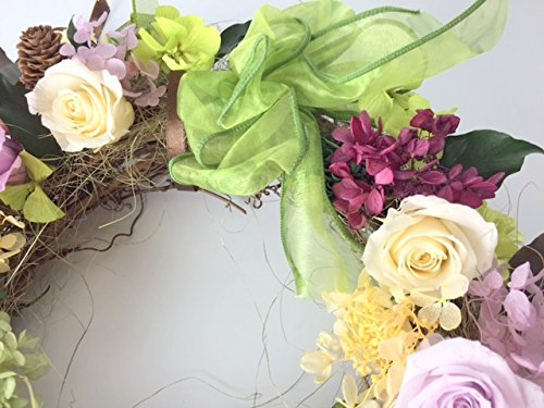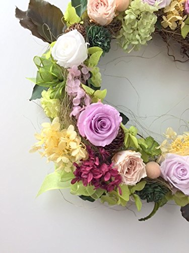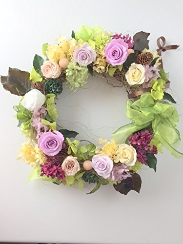 - いつまでもきれいが続く魔法のお花プリザーブドフラワーを贈りませんか。優しいお色のプリザーブドフラワーをふんだんにあしらったパステル調のフラワーリースです。素材は自然なリーフや木の実をメインにアジサイやオーガンディのリボンをデザインしました。