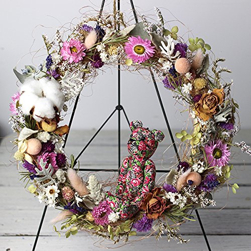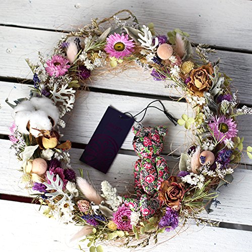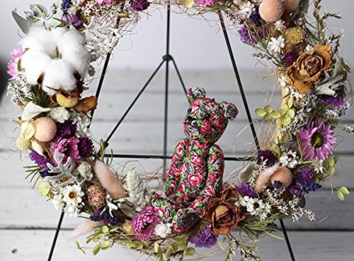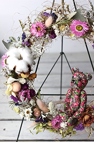 - ドライフラワーーと自然素材のリーフをメインにデザインした優しいフラワーリースです。ポイントに英国リバティ社のベアーが付いています。 直径26センチくらい ケース29センチ入り ベアーはリバティプリント製。(他のお色もございます。)