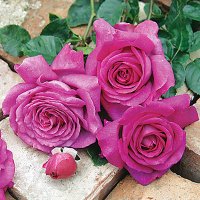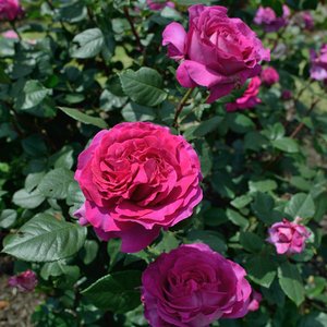 - 作出国:フランス 。花弁色:パルマヴァイオレット。咲き方:四季咲き。樹高: 1.2m。樹形:スプレーブッシュ。花径: 10~12cm。花形: シャローカップ。香り: ダマスク 強香。