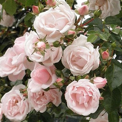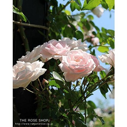 - つるバラの銘花。八重のカップ咲き。大きな花房を形成し、アイボリーピンク色で軟らかな雰囲気です。春から秋まで繰り返し咲きますが、春の咲き出しの美しさは格別です。細く優美なつるは3m以上伸びますので、フェンス、トレリスに適しています。日陰に強いのも大きな特徴で、北向きの壁面や1日の日照4時間以下の場所でも栽培できます。