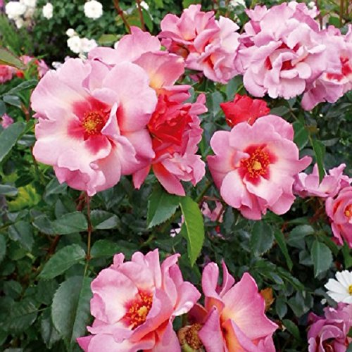 - ピンクにくっきりとした赤い大きなブロッチが入り、花弁数は5~8枚程度まで肥培状況によって変化する。 数輪から大房になって開花し、花付きがとても良い。 完全な四季咲き性で、春以降も次々と開花し続ける。 樹勢がとても強く、耐病性もとても優れており、初心者でも安心して栽培できる品種。 株は強い横張り性のシュラブだが、伸びすぎることがなく、コンパクトにまとまって自立し、全体としてはクッション状の形になる。 冬季の剪定で株型を整え、通常のブッシュ・ローズのように扱うとよい。 2015年RHSローズ・オブ・ザ・イヤー受賞。