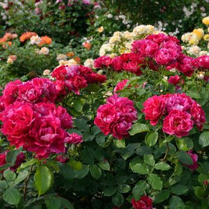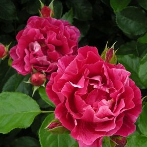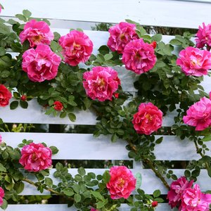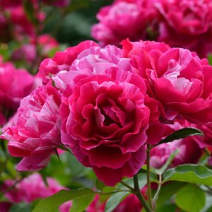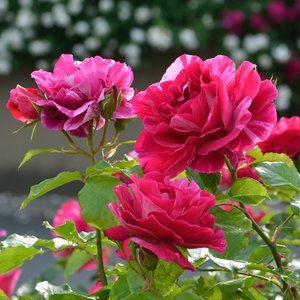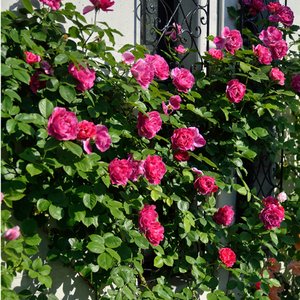 - 作出国:フランス 。花弁色:赤紫、白絞り。咲き方:四季咲き。 樹高: 1.5m。樹形:半つる。 花径: 8~10cm。 花形: セミダブル。 香り: フルーティー。