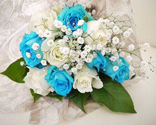 - 【花束について】水色のバラと白いバラの花束 バラ10本 カスミソウ お花の取扱説明書・切り花鮮度保持剤付き