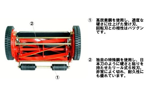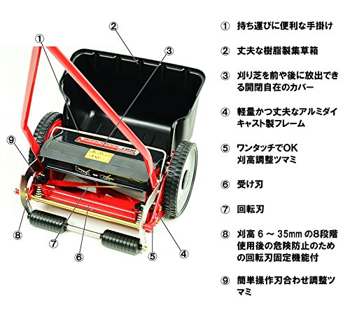 刈り上がりが違う。耐久性が違う。 ●刈幅30cmで効率よく刈れます。(30~45坪/時) ●リール式6枚刃で、刈高は8段階(6・9・13・17・20・25・30・35mm) (通常管理は6~30mmがおすすめ、35mmは初期生育用となります。) ●リールカバーの後部を開けば、刈り芝を後方へも排出可能。 ●使用後の危険防止のため回転刃を固定できる安全装置付 重量 本体:約10kg(集草箱含む) 集草箱:約0.8kg、機体寸法:全長134×全高70×全幅44cm、付属品付(研磨剤、ラッピング用ハンドル、ラッピング用ブラシ)、製造国:日本 ご自身で簡易研磨が可能です。 製品は1年間保証です。 ※簡単な組立が必要です。