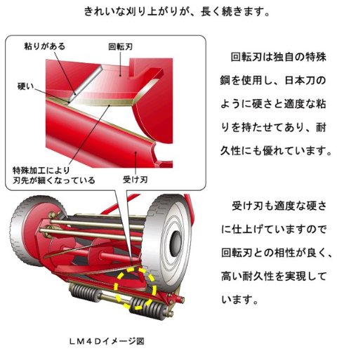 - 製品の仕様は予告なく変更する場合がございます。※LM4Dでゴルフ場のグリーンのような刈り込みは出来ません。(芝刈りの1/3法に関係し、クリップ率=22.3mmのLM4Dでは芝にダメージを与えやすいという判断があるためです。)