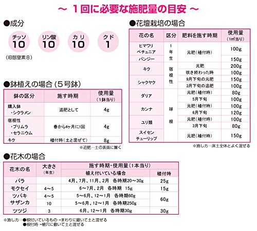 - 肥料成分(N:P:K)は10:10:10とバランスよく含まれており、植え付け時の元肥や、生長に応じて施す追肥のどちらでも使えます。