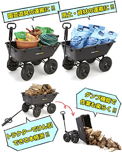- 最大積載量544kgで1つのハンドルで手で引っ張ったり、トラクターでけん引できるように変形する本格派です。