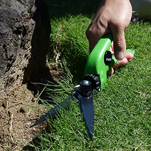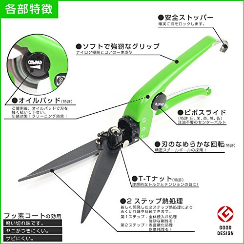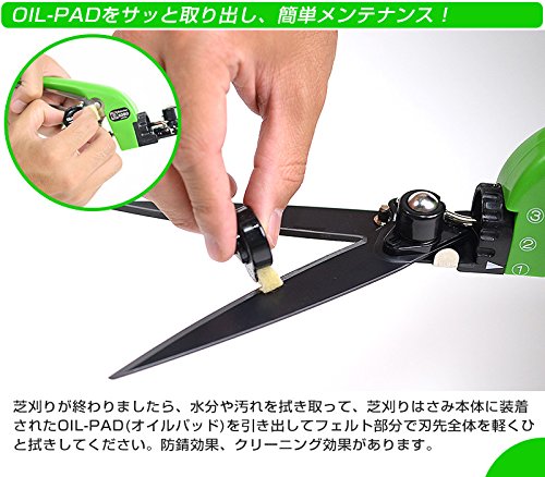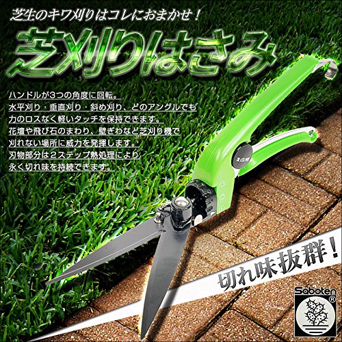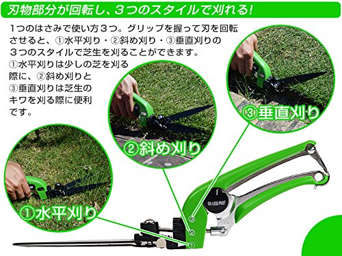 - 刃物部分が90度回転しますので、水平刈りから垂直刈りまで、どんな場所でも芝生でもカットできます!使わないときは刃のストッパーをかけておけば、刃は開かず安全です。