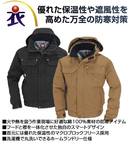 [素材] チノクロス、撥水加工(アクアトップ) [混率] 綿100% [サイズ] L [色] ブラック [入数] 1着 ハードな環境でタフに機能する綿100%防寒ギア! [特長] ●火や熱を扱う作業に適した綿100%素材を使用 ●フードと衿を一体化させた独自のスマートフォルム ●首まわりに保温性のよいマイクロブロックフリースを採用 ●洗濯機で丸洗いできるホームランドリー仕様 [注意点] 印刷の都合上、カタログと実際の商品カラーとは多少異なっている場合がございます。商品のデザイン、仕様は予告なく変更となる場合がございます。
