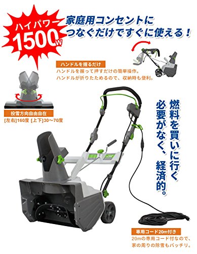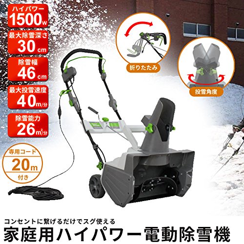 - 家庭用コンセントにつなぐだけですぐに使える!コード式ハイパワー電動除雪機。 1500Wのハイパワーで積もった雪を飛ばし、玄関前や車庫などの除雪もラクラク。 ハンドルを握って押すだけの簡単操作。