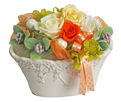 二種類のリボンでボリュームたっぷり。バラも大輪→中→小のバラを濃淡で使用し、バランスを付けました。器からはみ出んばかりの可愛らしい実もアクセントとなってアレンジを引き立てます。ナチュラルさの中にもフェイクパールや、模様の個性的な器が品の良さを出します。お手軽に癒しのアイテムとしても、ちょっとした飾りにいかがですか??