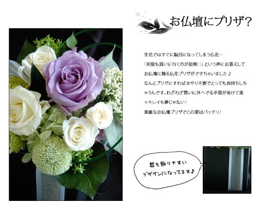 生花ではすぐに駄目になってしまう仏花・・・「何度も買いに行くのが面倒!!」という声にお答えしてお仏壇に飾る仏花プリザができちゃいました♪なんとプリザにすれば水やり不要でとっても長持ちしちゃうんです。わざわざ買いに出かける手間が省けて楽々キレイも夢じゃない。素敵なお仏壇プリザでこの夏はばっちり!