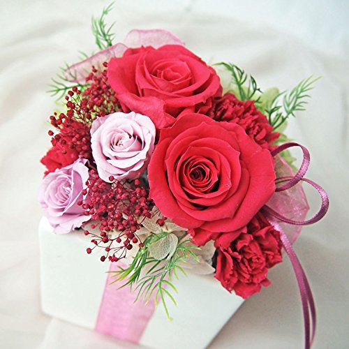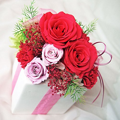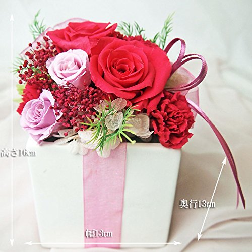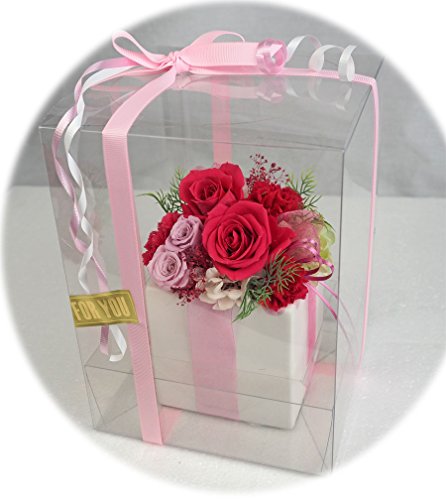 当店大好評!のメアリーに、埃から保護するクリアケースと可愛いラッピングが付いてのお届けです。 シンプルまスクエアな花器にローズ・カーネーション等でまとめあげた可愛らしいアレンジです。お誕生日等のギフトはもちろん、自分へのご褒美にも!様々なシーンでお使いいただけます。