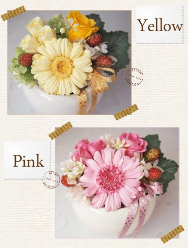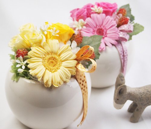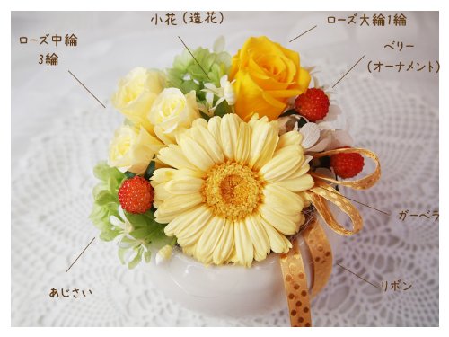 - 使用花材:ガーベラ・ローズ・ミニローズ・紫陽花・リボン・オーナメント・造花