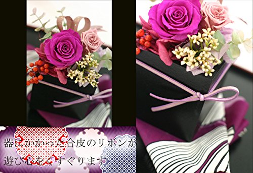 和風アレンジをあまり意識させないアイテム。器にかかった合皮のリボンが遊び心をくすぐります。お部屋の床の間や玄関先にぴったりな、シックなのに可愛い和風プリザーブドフラワーです。世代問わず楽しんでいただけるプリザーブドアレンジメントです。