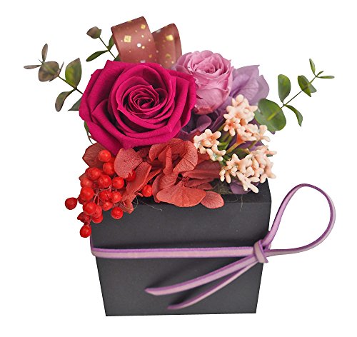 - 使用花材:プリザーブドフラワーローズ2輪・プリザービングアジサイ・フェイクグリーン・プリザービングペッパーベリー・オーナメント・和柄リボン&合皮リボン 他