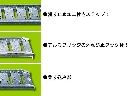 SBAタイプは農業機械全般・一部小型建設機械(ゴムタイヤ・ゴムクローラー)用に設計・開発されたアルミブリッジです。ステップ間隔が狭く、それぞれに滑り止めタイヤガードが付いており、突起がタイヤのブロックをしっかりととらえるため、滑りにくくスムーズに乗せ降ろしすることができます。
