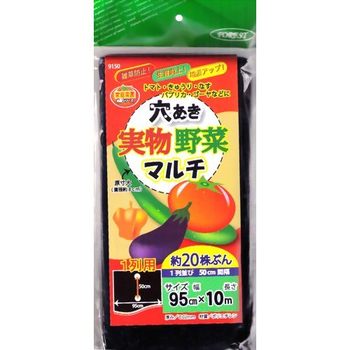 ●【商品説明】●「FOREST 穴あき実物野菜マルチ 1列用 95cm×10m」は、雑草防止・生育向上・地温アップに役立つ穴あき雑草防止シートです。●穴の大きさは直径約8cm、1列並びの50cm間隔で約20株分あいています。●トマト、きゅうり、なす、パプリカ、ゴーヤなどに。●【使用方法】●(1)ウネを作り、肥料や水をまいた後、マルチを敷きます。●シートの端は土をかぶせるか、止め具でしっかりと固定します。●(2)穴に苗を植え付けます (または種をまきます)。●最後に水をたっぷり与えましょう。●【使用上の注意】●燃えるので火に近づけないでください。●日陰や屋内で保管してください。●【材質】●ポリエチレン●【原産国】●中国●まとめ買いの場合、システムの仕様で個数分の送料が加算される場合がありますが、送料は1配送先につき1個分の金額となります。●システムの仕様で配達日を指定出来る場合がありますが、配達日の指定は出来ませんのでご了承ください。尚、時間指定は出来ます。●ご注文確定後のキャンセルならびに、お届けしました商品のお客様都合による「返品 交換」は行ってお...