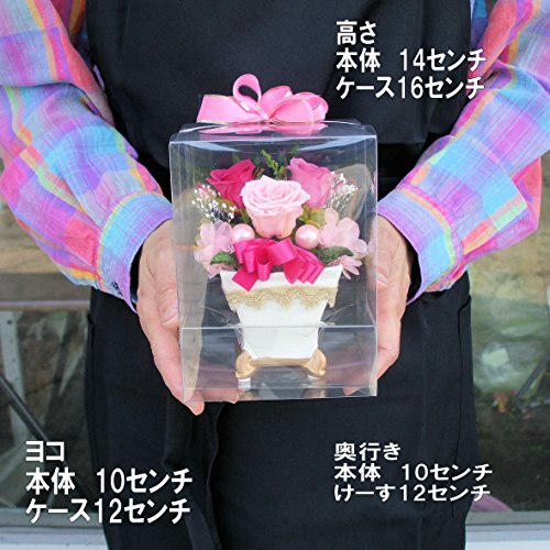 生花に特殊な加工を行い、美しい状態が長く楽しめる「プリザーブドフラワー」のアレンジメントです。 ケースに入っているのでお花にホコリなどが付かず更に長持ちします。 アレンジメントは1つずつ手作りで作成しておりますので、画像と多少異なる場合もございます。