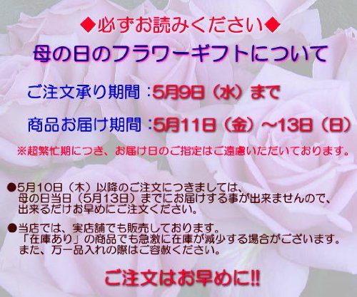 - ◆商品のお届け期間:5月11日(金)~13日(日)の間のいずれかにお届け致します。 ※超繁忙期につき、お届け日の指定はご遠慮頂いております。