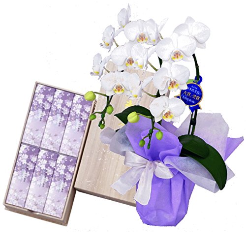 日本香堂のお線香 宇野千代 淡墨の桜 特選ミディ胡蝶蘭 2本立ち 白色 4号陶器鉢 お供えラッピング セット