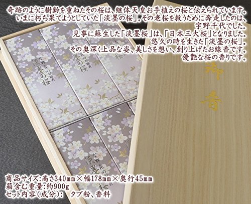 - お線香は、日本香堂の宇野千代 淡墨の桜。岐阜県根尾村に爛漫と春を告げる樹齢1500年の桜があります。その名は「淡墨の桜」(うすずみの桜)。 まるで山里に湧き出した春霞のように美しく咲き誇り、やがてゆっくりと淡い墨色に変わることから そう呼ばれたといわれています。多くの人に愛され、そして多くの人を癒してきた「淡墨の桜」。その限りない、優しさと包容力をイメージしたお線香です。