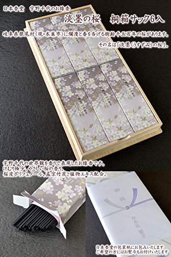 - お線香は、日本香堂の宇野千代 特撰淡墨の桜。岐阜県根尾村(現・本巣市)に爛漫と春を告げる樹齢千五百年の桜があります。 その名は「淡墨(うすずみ)の桜」。 奇跡のように樹齢を重ねたその桜は、継体天皇お手植えの桜と伝えられています。 いまに朽ち果てようとしていた「淡墨の桜」。その老桜を救うために奔走したのは、宇野千代でした。 見事に蘇生した「淡墨桜」は、「日本三大桜」となりました。 悠久の時を生きた「淡墨の桜」。その奥深く上品な姿、美しさを想い、創り上げたお線香です。 優艶な桜の香り。天然白檀を配合しています。 お線香は黒地に上品な桜の花をあしらった巻紙でお包みしています。 塗箱を開けると、優しい香りが広がります。
