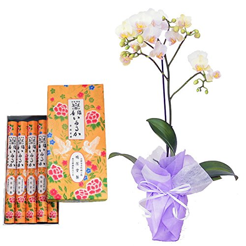 鳩居堂のお線香 いかるが ミディ胡蝶蘭 1本立ち リトルスノウ 白色 陶器鉢 お供えラッピング セット