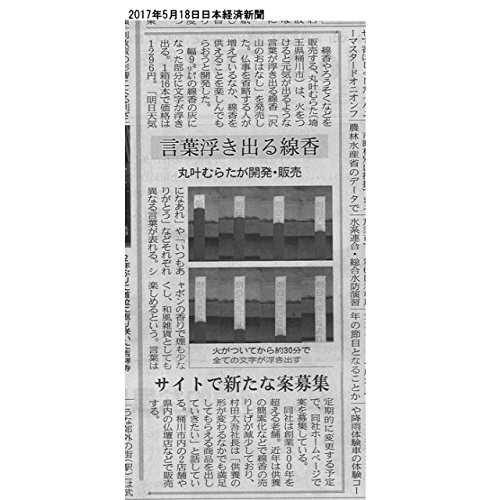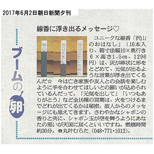 - お線香は、丸叶むらたの「沢山のおはなし 16本入 文字の浮き出るお香」。ご先祖様と、あの人と、おはなしを楽しむように使ってほしいという気持ちを込めて作った商品です。火をつけると灰がそのまま残ってそこに元気の出る言葉が浮き出てきます。 - 浮き出る言葉の例 - ・明日天気になあれ ・元気を出して ・いつもありがとう ・しあわせ など 全部で16種類の言葉が出てきます。どの言葉が出るかは出てきてみないとわかりません。毎日楽しみになること間違いありません!