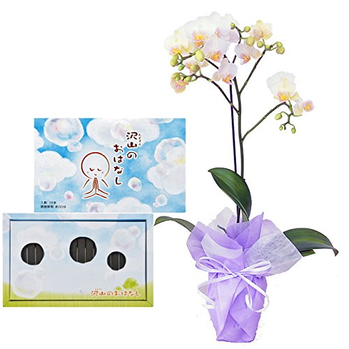 丸叶むらたのお線香 沢山のおはなし 16本入 文字の浮き出るお香 ミディ胡蝶蘭 1本立ち リトルスノウ 白色 陶器鉢 お供えラッピング セット