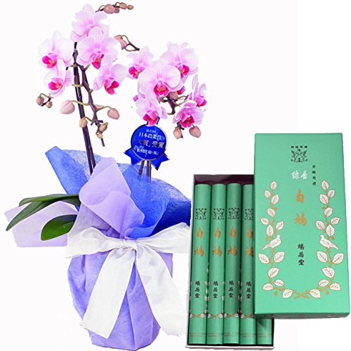 鳩居堂のお線香 白鳩 特選ミディ胡蝶蘭 2本立ち ピンク色 4号陶器鉢 お供えラッピング セット フランス製リボン