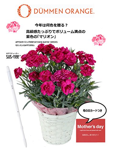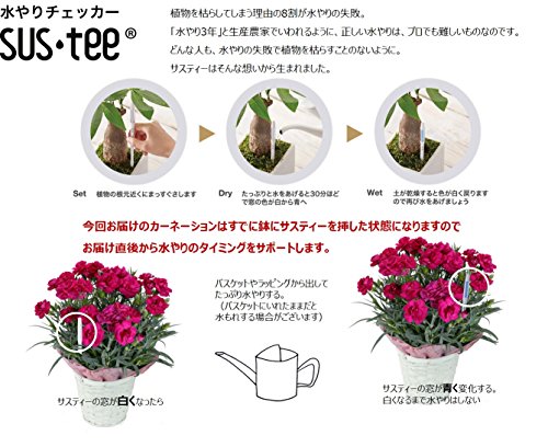 - カーネーション(紫色)5号鉢、バスケット、水分計(SUSTEE)、お花のお手入れ説明書。