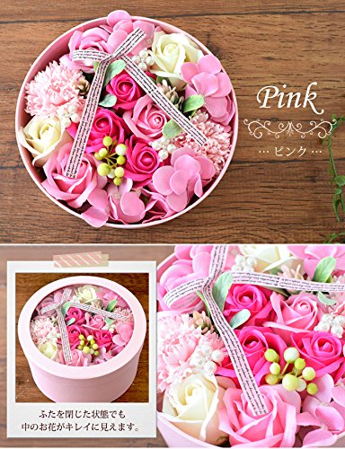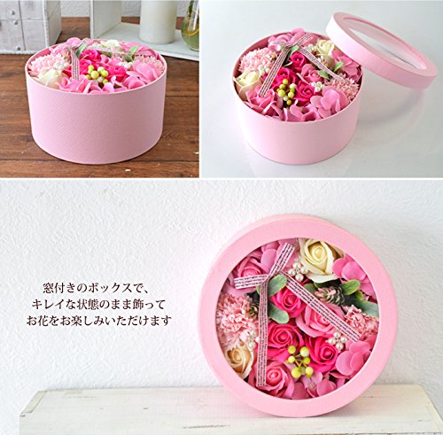 - 見て楽しめ、香りで楽しめるソープフラワーのラウンドボックスフラワーアレンジメントです。蓋を閉じた状態からも中のお花がきれいに見える窓付きボックスです。お誕生日のプレゼントやお祝いにはもちろん、花粉がないのでアレルギーのある方への贈り物や、お見舞いにもおすすめです。
