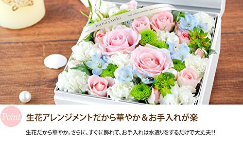 - 【サイズ】約:横17×奥行17×高さ10cm 【内容】生花アレンジ:季節の花各種/グリーン/花由オリジナルBOX/吸水性スポンジ/リボン/ご希望の方にメッセージカード、手提げ袋/お取扱説明書