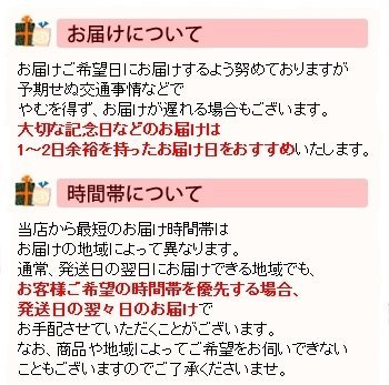 - ●冬季は凍結の恐れのため、北海道へのお届けは休止しております。●沖縄宛の配送について、大幅な遅延が発生しており、当面の生花・鉢植え商品のお届けを休止いたします。予めご了承くださいませ。(12/18更新)●北陸・新潟県のお届けについて、大雪の影響で大幅な遅延が発生しております。該当地域につきましても、今後の天候によってはさらなる遅延が予想されますので、予めご了承くださいませ(2018/1/16更新)